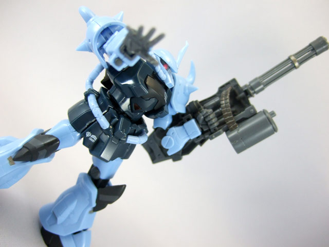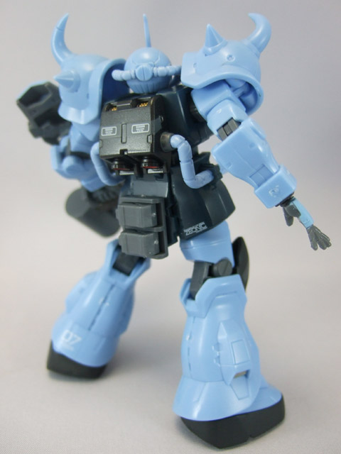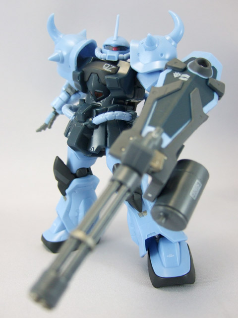 グフカスタムは、グフ – Wikipediaによると『型式番号から設定資料によってはB3グフと呼称する事もある。著名な搭乗者はノリス・パッカード。公式表記は「グフ・カスタム」と中黒が入る。グフが配備が進むにつれ、白兵戦を重視したコンセプトのため攻撃範囲が狭い、また固定武装としたためデッドウェイトとなり汎用性に欠けるなど前線での運用に不便な点が浮上した。そこでグフを全面的に見直し、固定武装を廃して射撃武装を着脱式とし中近距離射撃能力を向上させた機体として再設計した機体がグフカスタムである。開発にはMS-07H-8グフフライトタイプと同じパーツを用いて行われたとも言われ、外観にも共通点が多く見られる。』という機体。