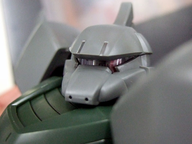 今回、頭部の回転に連動するモノアイギミックが搭載されていて、キャラシティでまだ作成中のサンプルをちょっといじらせていただきましたが、正面の状態のときは、画像左のように正面にモノアイがありますが、左に首を動かすと、連動して画像中央のように、モノアイも左に動きます。もちろん右に動かせばモノアイも右に。