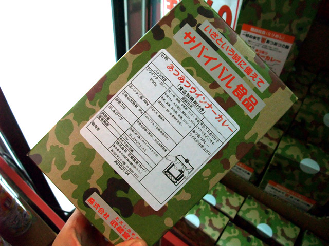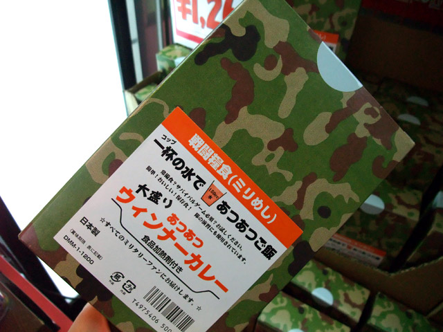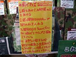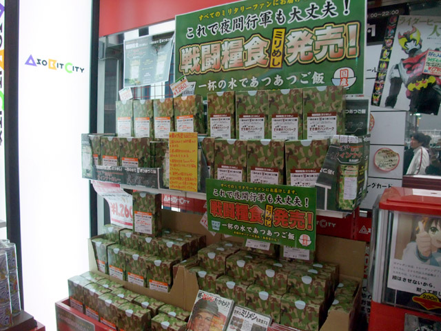 POPには「すべてのミリタリーファンにお届けします。これで夜間行軍も大丈夫!戦闘糧食ミリめし発売!コップ一杯の水であつあつご飯 本物のサバイバル食品!保存食にも!」とかかれて、ため方なども掲示されていました。