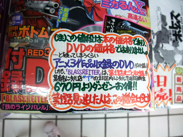 とらのあな1号店のPOPでは『(注)この値段は本の価格であり、DVDの価格ではありません。・・・と疑ってしまうくらいアニメ3作品収録のDVDが付録!!しかも「BLASSREITER」は、第1話丸ごと収録!!某有名レンタル店”T”の23区内レンタル7泊8日料金670円よりダンゼンお得!!第1話見逃した人は、この機会にゼヒ!!』と書かれていました。
