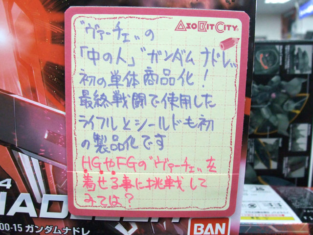 キャラシティのPOPでは『”ヴァーチェ”の「中の人」”ガンダムナドレ”初の単体商品化!最終戦闘で使用したライフルとシールドも初の製品化です HGやFGの”ヴァーチェ”を着せる事に挑戦してみては?』とかかれていました。