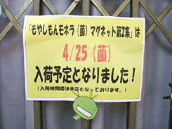 海洋堂ホビーロビーは、水曜日が定休日なので、23日はお休みでしたが、『「もやしもんモネラ(菌) マグネット第2集」は4/25(菌)入荷予定となりました!』という告知が掲示されていました。
