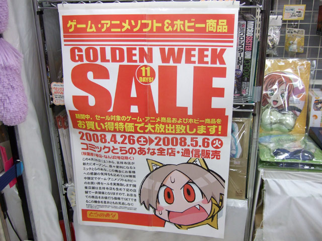 また、とらのあな本店では、4月26日(土)より、「期間中、セール対象のゲーム・アニメ商品およびホビー商品をお買い得特価で大放出致します!」という、「ゲーム・アニメソフト&ホビー商品 GOLDEN WEEK SALE 11DAYS!」を今年も開催するみたいです。