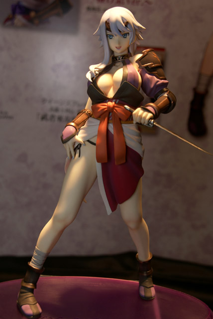これは、以前宮沢模型展示会2008春での展示もお伝えした、クイーンズブレイドシリーズの、ビジュアル&CDドラマブック「武者巫女絵巻」に登場する「甲魔忍軍頭領シズカ」を立体化したもので、メガハウスの商品説明によると『原型を手がけるのは、人気原型師の田中冬志氏。氏の卓越した技術によって、セクシーでかっこいいシズカの姿が完全再現されているのはもちろんだが、さらにエクセレントモデルCOREならではの遊び心も満載!セクシー忍者の魅力に、どっぷりと浸れそうだ。』と紹介されています。