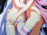 POPによると「オレの嫁(オイ)2人の艶姿!( ゚∀゚)o彡 ニーソ!ニーソ!おっぱいニーソ!」という、上坂茅羽耶と三好由比子の二人が寄り添うイラストの「ソフマップ特典 描き下ろしベッドシーツカバー」の全体と一部など。