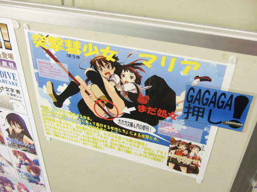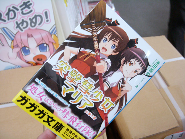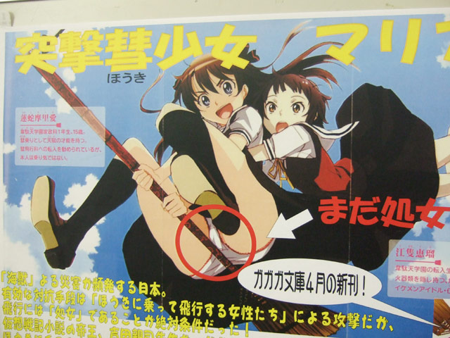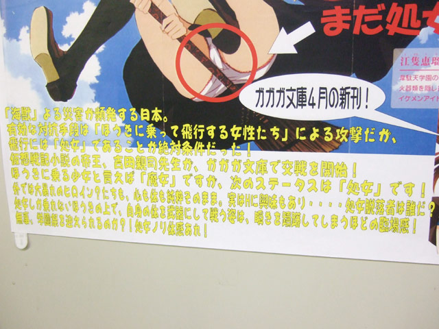 小説「突撃彗少女マリア」(AA)のPOPがK-BOOKSで掲示されてます。それにはイラストのパンツ部分(股間部分?)を囲み、大きくまだ処女とかかれていましたw これは、POPによると『「海獣」よる災害が頻発する日本。有効な対抗手段は「ほうきに乗って飛行する女性たち」による攻撃だが、飛行には「処女」であることが絶対条件だった!』という設定だからみたいですw