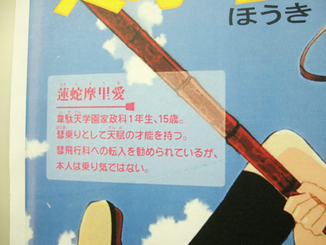 POPのイラストには、POPの紹介によると「韋駄天学園家政科1年生、15歳。彗乗りとして天賦の才能を持つ。彗飛行科への転入を勧められているが、本人は乗り気ではない。」という、蓮蛇摩里愛のパンツ部分(股間部分?)を囲み、大きくまだ処女とかかれていましたw