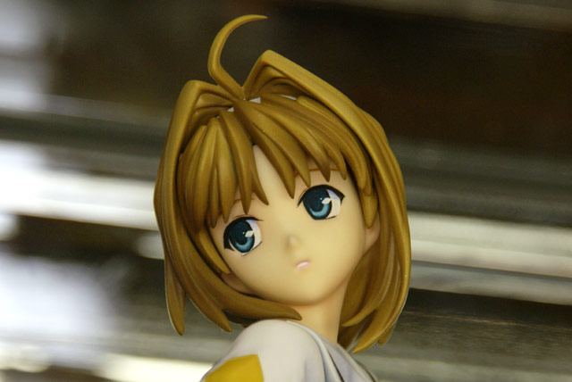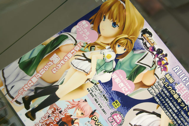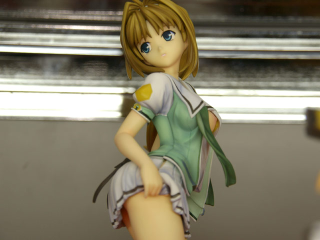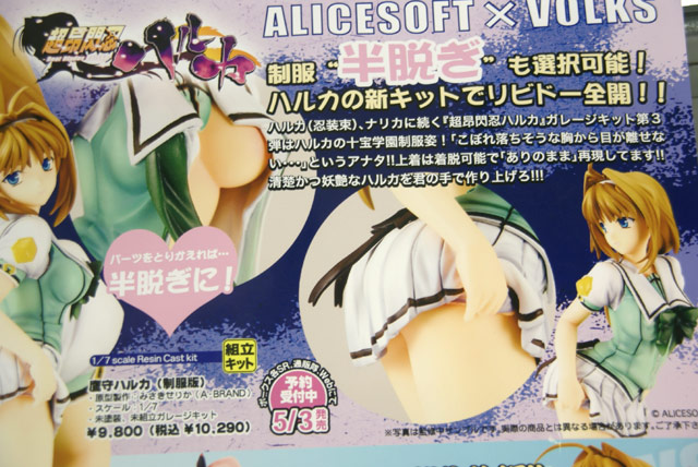 これは、アリスソフトのエロゲ「超昂閃忍ハルカ」のキャラ「鷹守ハルカ」を制服姿で立体化したガレキで、隣に掲示されていたPOPによると『制服”半脱ぎ”も選択可能!ハルカの新キットでリビドー全開!!ハルカ(忍装束)、ナリカに続く『超昴閃忍ハルカ』ガレージキット第3弾はハルカの十宝学園制服姿!「こぼれ落ちそうな胸から目が離せない・・・」というアナタ!!上着は着脱可能で「ありのまま」再現してます!!清楚かつ妖艶なハルカを君の手で作り上げろ!!!』と紹介されています。