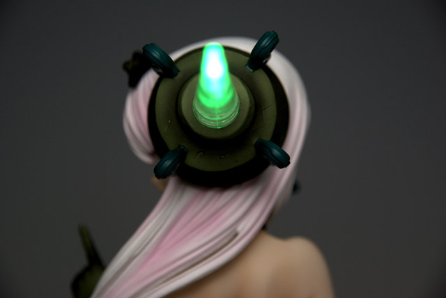 発光ギミックの仕組みは、角部分自体が発光しているわけではなく、頭部にボタン電池使用の電池ボックスとライトが仕組まれていて、そのライトからでる光を角が増幅させて光っている感じです。