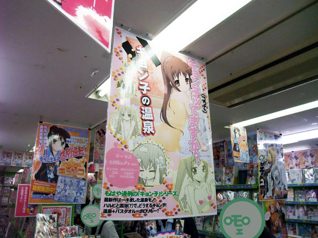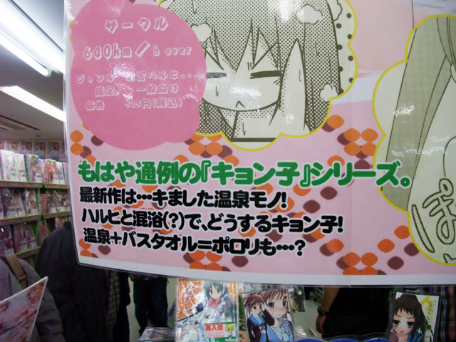 掲示されていたPOPには『もはや通例の「キョン子」シリーズ。最新作は・・・キました温泉モノ!ハルヒと混浴(?)で、どうするキョン子!温泉+バスタオル=ポロリも・・・?』と書かれていました。