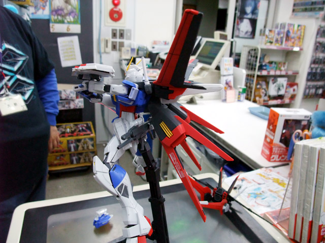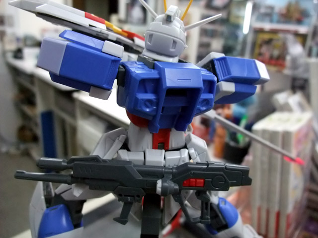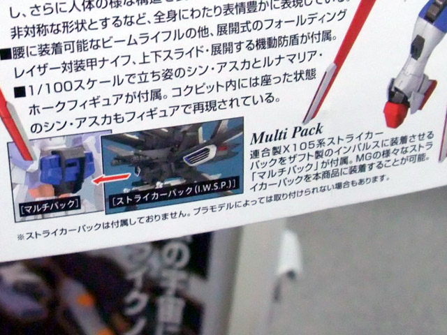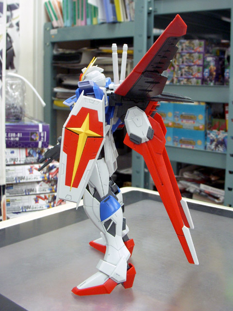 パッケの解説によると『連合製X105系ストライカーパックをザフト製のインパルスに装着させる「マルチパック」が付属。MGの様々なストライカーパックを本商品に装着することが可能。』という「マルチパック」を使って、エールストライクガンダムのストライカーパックをつけてみた様子。