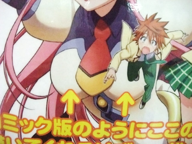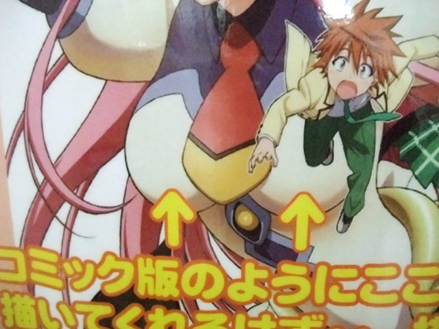 8月28日発売予定のDS「To LOVEる ワクワク!林間学校編 限定版」(AA)の予約受付が、ソフマップAM館で開始していて、POPが掲示されていました。そのPOPでは、ララの両乳首部分に矢印がついていて「煙や湯気で隠さないで先端まで出したら神!」とか「コミック版のようにここの先端まで描いてくれるはず・・。描くんじゃないかな・・。描いてほしいなぁ。」と書かれてましたw