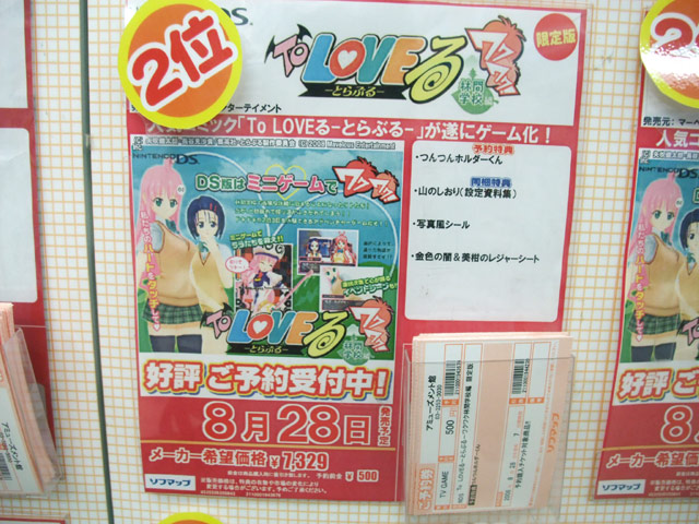 8月28日発売予定のDS「To LOVEる ワクワク!林間学校編 限定版」(AA)の予約受付が、ソフマップアミューズメント館で開始していて、POPが掲示されていました。