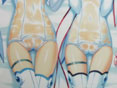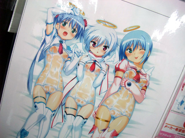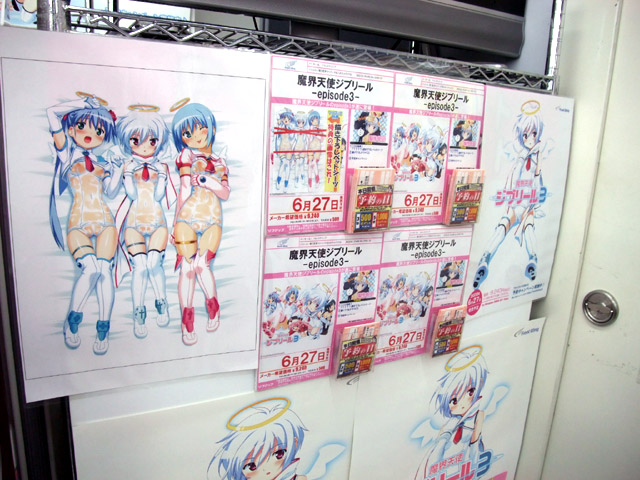 以前、修正版のイラスト展示をお伝えした、6月27日発売予定のフロントウイング「魔界天使ジブリール3」(SA)のソフマップ特典「スケスケ3人娘?等身大描き下ろしベットシーツ」ですが、ソフマップアミューズメント館にて、無修正サンプルの展示が開始していました。