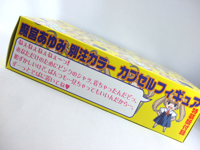 側面には「ねぇねぇねぇねぇ~っ!!あなただけのためにピンクのシャツ、着ちゃったんだぞっ。恥ずかしいけど,ぱんつも・・・見ちゃっていいんだから・・・。ずーっとそばに置いてね」「自分だけのものにして、虜にして、パンツをのぞくつもりなんでしょっ!もうっ! 一生見てくれなきゃ許さないんだから!あなた、ぜったいシアワセ者よ!」など、ツンデレな台詞がw