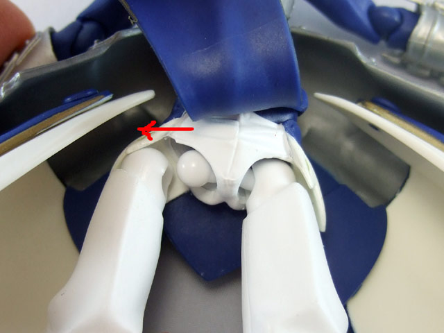 まず、セイバーの股関節を、左図を参照に、矢印方向のように「必ず真横から」引き抜きます。