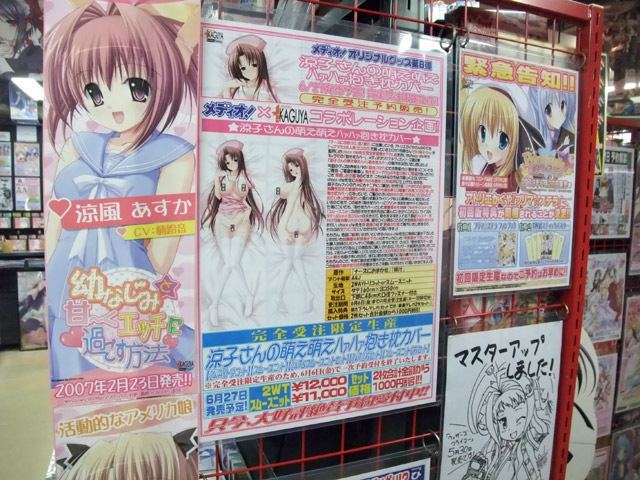 アキバOSさんも記事にされていますが、メディオ!「涼子さんの萌え萌えハァハァ抱き枕カバー」の告知POPがメディオ!にて掲示開始されています。これは、アトリエかぐやのエロゲ「ナースにおまかせ」(AA)、「姉汁 ~白川三姉妹におまかせ~」(AA)のキャラ「白川涼子」を両面描き下ろしイラストを用いた、抱き枕カバーにしたものです。裏面?ではお尻側から「くぱぁ」してましたw