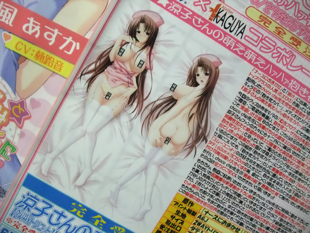 これは、アトリエかぐやのエロゲ「ナースにおまかせ」(AA)、「姉汁 ~白川三姉妹におまかせ~」(AA)のキャラ「白川涼子」を両面描き下ろしイラストを用いた、抱き枕カバーにしたもので、やたら長いPOPの商品説明によると、『「ナースにおまかせ」と「姉汁」に出演している、アトリエかぐやさんの中でもトップクラスの人気(とエロさ)を誇っているエロカワお姉さん「白川涼子さん」を起用したchoco chip先生完全新規描き下ろし絵を用いたchoco chip先生キャラ初の「抱き枕カバー」メディオ!オリジナルグッズシリーズ第8弾「涼子さんの萌え萌えハァハァ抱き枕カバー」の製作を決定いたしましたっ!!今回のグッズは昨年の9/9の「担当ブログ」にてお客様から「抱き枕」についてのご意見・ご要望を募集し、抱き枕ユーザからの多数の熱いご要望があったからこそ”実現した企画”なのですが、こちらからは元の作品が激しくエロいだけにchoco chip先生に表裏どちらとも直球エロな絵柄に仕上げていただき、涼子さんファンの方々にも十二分にご満足いただける「これまでの圧倒的な姉属性加えて絶望的な萌えエロ破壊力も誇る萌エロ破壊力を持つことになった抱き枕カバー」となっていて、ご覧のとおりのおもわずいさぎよいエロの心が出てしまった結果だった思わず息子ライジングなエロ素晴らしい絵となっているのですが、この絵を「抱き枕カバー」にプリントする生地やサイズなどの仕様についても、「抱き枕カバー」として最重要な生地は「2WAYトリコット」か「スムースニット」のお好きな生地を自由に選んでいただくことにし、サイズはタテ160cm x ヨコ50cmの大きさで、抱き枕本体を入れる下部はファスナーを付け可能な限り大きくする等、現状つくり得ることのできる最高の組み合わせを行い、choco chip先生の”最高の絵”を”最高の仕様”で製作いたしますので、その点は全力でご安心いただきたいと思いますっ!!もちろん、毎回ご好評いただいていますchoco chip先生に特別に描き下ろしていただいた超貴重な新規描き下ろし絵をテレカにした「特製描き下ろしテレカ」も購入特典としてバッチリご用意していますですが、さらに!「抱き枕カバー」は、かなりの方が2枚以上の複数枚ご購入されるというリサーチ結果も出ましたことから、2枚セットでお買い上げいただくと1000円ほどお安くなる気持ちおトクなセット割引も設けましたので、すでに抱き枕の魅力に取り憑かれている方はもちろんのこと、今まで抱き枕を買われたことの無い抱き枕ビギナーな方にも、この魅惑の抱き枕の世界を是非ともご体験いただきたいと思いますですよッ!!!!』と紹介されています。