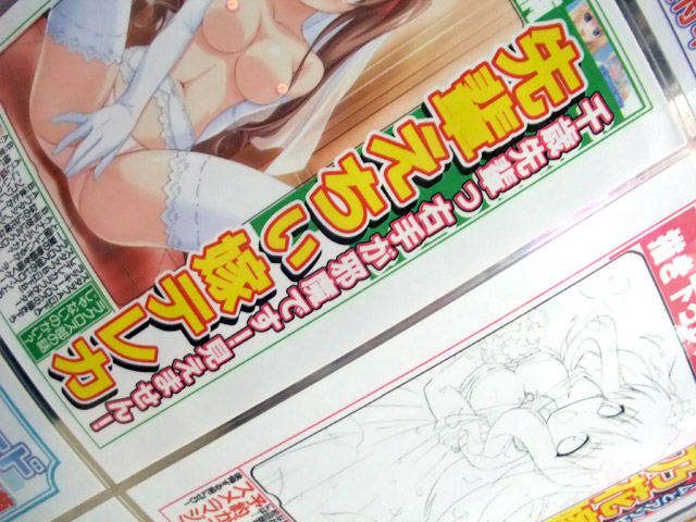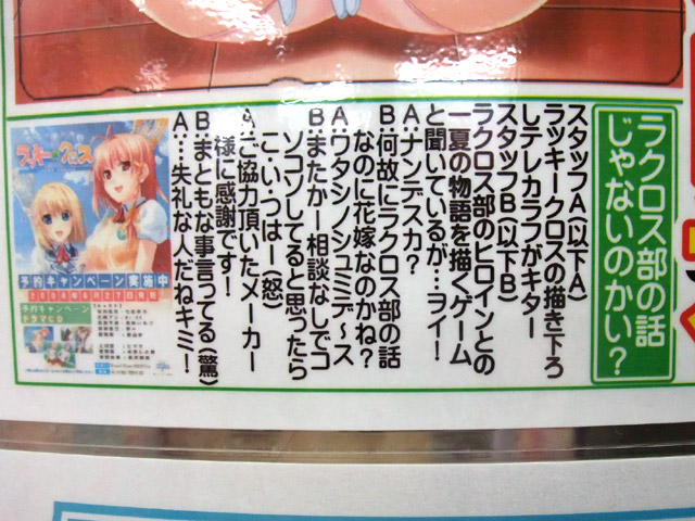 6月27日発売予定のコトノハのエロゲ「ラッキー×クロス 初回版」(AA)ですが、「俺の嫁を探せ強化月間」のゲームシティにて、アソビット特典テレカイラストの公開が開始してました。イラストは「B:何故にラクロス部の話なのに花嫁なのかね?A:ワタシノシュミデ~ス」という、「日高千歳」のエロ嫁姿。POPに「千歳先輩っ右手が邪魔です!見えません!」とあるように右手の位置が