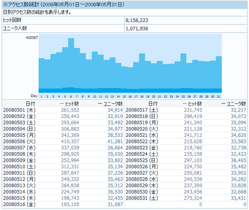 総ヒット数は815万6223。総ユニーク数は107万1936でした。トップページへのアクセス151万3421PV。(内、新環境トップは150万7722、旧ライブドアブログトップは5699)