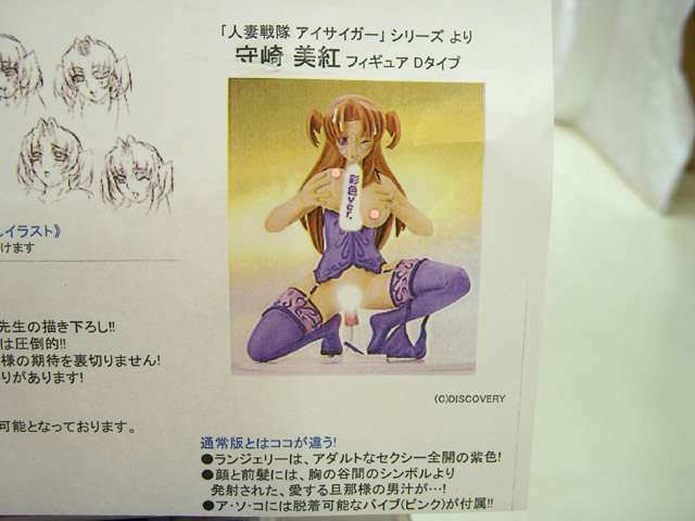 これは、登場する女性キャラが全て「人妻」という「人妻戦隊アイサイガー」の「守崎美紅」を御奉仕ポーズで立体化したもので、ギガパルスの商品説明によると『「若妻巨乳パイ○リフィギュア」これが今回のテーマです!! いろんな意味でお待たせ致しました!REDゾーンシリーズ3部作のトリを飾るのはDISCOVERYが送る戦う人妻ゲーム「人妻戦隊 アイサイガー」シリーズ よりサイガーローズこと守崎美紅(24歳・もちろん人妻)!”巨乳で若妻!”とある意味燃える設定ときたら、表現するはただ一つ!それは!パ・イ・○・リ!!と言うことで、もう多くを語らなくてもいいでしょう!愛する旦那様との夜の営みを彷彿とさせる、大胆なシチュエーションを原型師がこだわりまくって肉感溢れる一品となりました。A、B、Cタイプのそれぞれのフュギュアを揃えると、ひとつのドラマが見えてきませんか・・・!?』と紹介されています。
