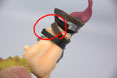 その際、丸で囲んだ部分が引っかかるので、ベルト部分を千切れないように気をつけながら引っかかりを外してあげます。