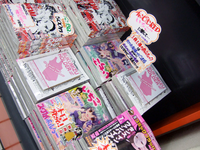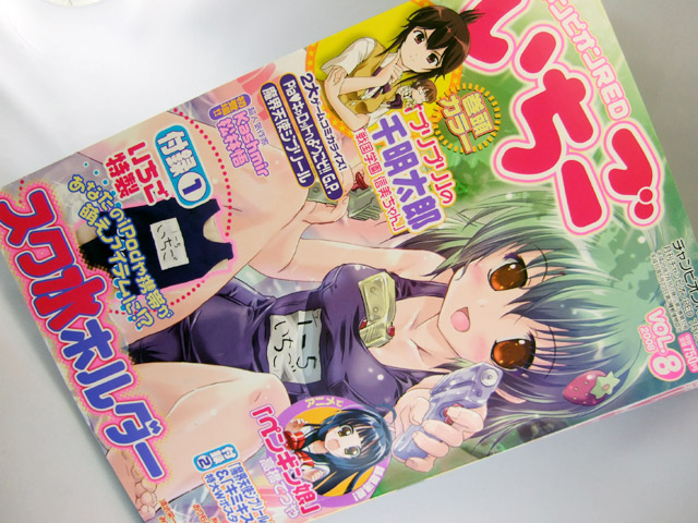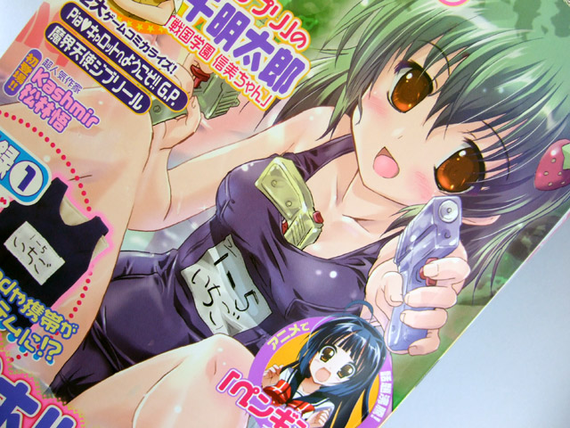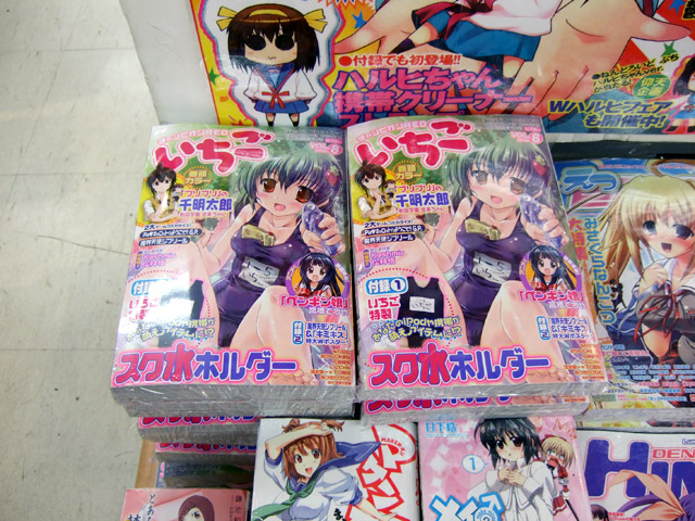 6月5日、雑誌「チャンピオン RED (レッド) いちご Vol.8」(AA)が発売されました。これは、サンプル展示のあったとらのPOP「いらぬ(?)豆知識」によると『iPodや薄型ケータイを入れるとひんぬーになり旧型の厚いケータイを入れるときょぬーになります。』という「スク水ホルダー」が付録していて、ゲームシティのPOPでは「ヤヴェ~。スク水が付いて来ちゃってますよ!!」とのことw