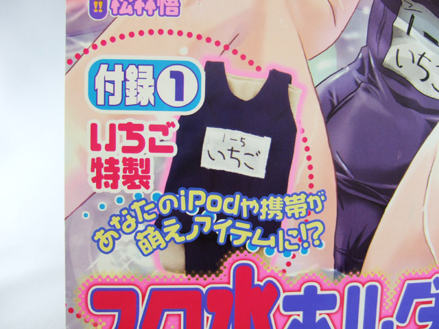 ・『iPodや薄型ケータイを入れるとひんぬーになり旧型の厚いケータイを入れるときょぬーになります。』 チャンピオンレッドいちごVol.8付録「スク水ホルダー」のサンプル展示