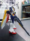 ウイングガンダムは、ウイングガンダム – Wikipediaによると『ウイングガンダムは、当時のウイングゼロの開発スタッフの1人ドクターJが自身の故郷L1コロニー群にて開発した機体である。本機は原型機ウイングゼロの特徴・コンセプトを最も強く受け継いだ機体であり、その外見や高速飛行形態「バード形態」への変形機構を初め、ゼロを模倣した機能・装備を持つ。但し、兵器としては過剰な性能を有していたゼロの反省から、バスターライフルの弾数制限やゼロシステムのオミットなど、その機能には大きく制約が掛けられている。それでも、OZの機体を充分上回る水準は維持されており、バード形態の併用による高い機動性と合わせ、5機の中では最も性能バランスに優れた汎用性の高い機体となっている。(パイロット:ヒイロ・ユイ)』という機体。