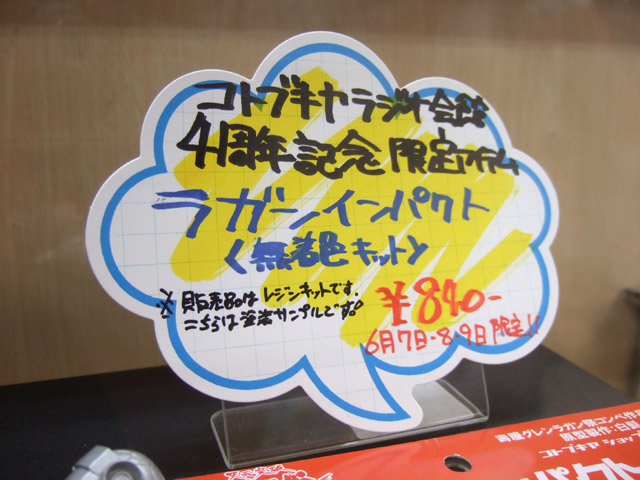 コトブキヤラジオ会館は今年で4周年を迎えるみたいで、4周年記念セールや、うちわ配布、8日には直筆サイン入作品集数量限定販売等が予定されています。その4周年記念アイテムとして、白髭創氏製作のガレキ「ラガンインパクト」が7日に発売されていました。これは、コトブキヤラジオ会館のみ500個限定で、6月7~9日の3日間限定で販売されるものみたいです。