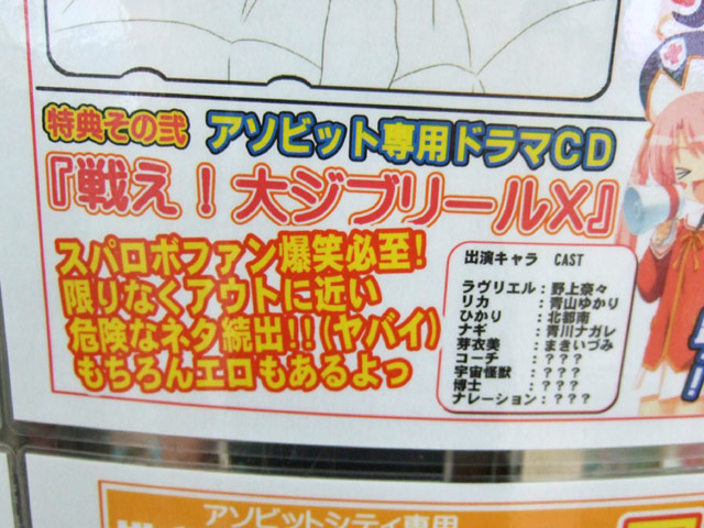 なお、アソビットではPOPによると「スパロボファンは爆笑必至!限りなくアウトに近い危険なネタ続出!(ヤバイ)もちろんエロもあるよっ」という、アソビット専用ドラマCD「戦え!大ジブリールX」も付属するみたいです。