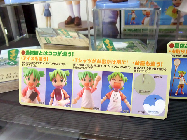 海洋堂「よつばと リボルテック DX 夏休みセット」(AA)のサンプル展示が海洋堂ホビーロビーにて開始してます。これは、2007年9月に発売された、よつばスタジオ×海洋堂コラボシリーズ「よつばと リボルテック」(AA)に、おでかけ衣装や多数のオプションを付属させたDX版。よつば本体のTシャツも、原作で牧場に行った時に着ていたワンポイント入りのものになっています。