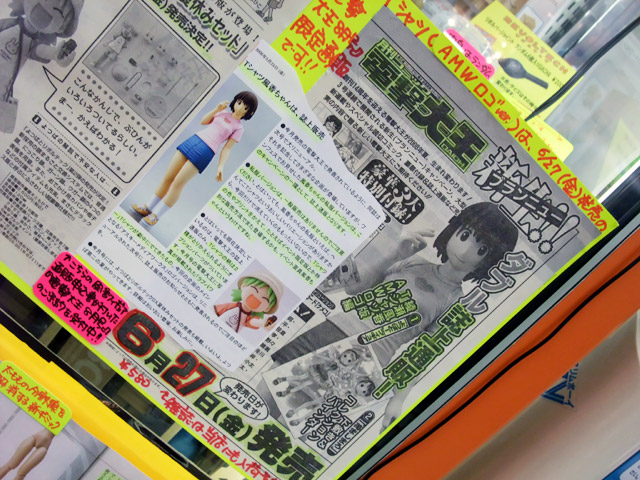 また、海洋堂「よつばと! 綾瀬風香 制服Ver.」(参考レビュー)のバリエーションで、シャナの抱き枕を赤ちゃんが抱いているPOPもお伝えした、6月27日発売の「ブランニュー」する『電撃大王8月号』での誌上通販となる「綾瀬風香 Tシャツ版 AMWロゴ編」の紹介POPも掲示されていました。