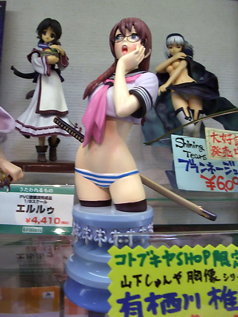 6月14日、コトブキヤショップ限定「アンジェラ」(RA)とコトブキヤ「有栖川 椎」(RA)の2種が発売されました。これは、コトブキヤショップ限定で展開されている、山下しゅんや氏の描き下ろしイラストを半身像で立体化する「The Art of Shunya Yamashitaシリーズ」のひとつ。イラストでも縞パン丸出しの「有栖川 椎」(RA)は、サンプルも展示されていました。