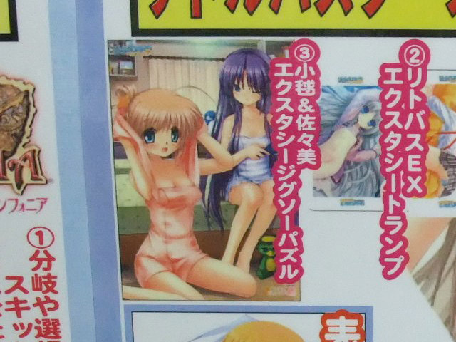 POPによると、今回の付録は『「バスト”69cm”を忠実に再現!」・・・てか、これは立体感あるのか?w』という「クド 立体マウスパッド」と「リトバスEXエクスタシートランプ」「小鞠&佐々美エクスタシージグソーパズル」の『これぞ、「胸囲(脅威)」の3大特典!』とのことですw