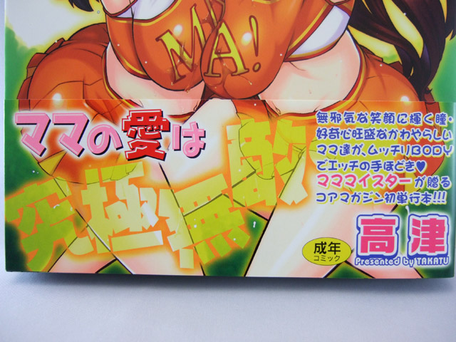 これは、オビの商品説明によると『ママの愛は究極無敵 無邪気な笑顔に輝く瞳・好奇心旺盛なかわやらしいママ達が、ムッチリBODYでエッチの手ほどき♥マママイスターが贈るコアマガジン初単行本!!!』『ママも欲しくなっちゃった・・・、だってママも女の子だもん♥』などと紹介されている、とらのあな発WEBコミック「虎星★来々!」の作者でもある、高津氏初の大人向けコミック。