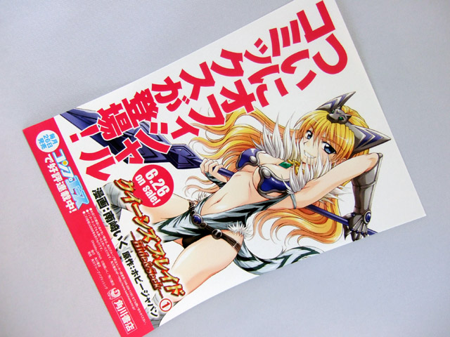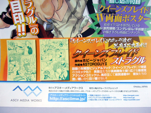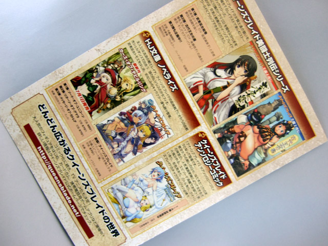他、6月26日発売予定のコミック「クイーンズブレイド -Hide&Seek- 1巻」(AA)や、クイーンズブレイド ストラグル連載中の雑誌「電撃黒マ王 2008年 08月号」(AA)等の告知も封入されていました。