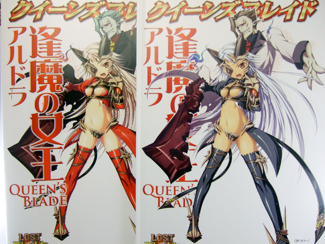 「TVアニメ化決定」告知とともに6月18日に発売された、ビジュアル対戦ブック「クイーンズブレイド 逢魔の女王アルドラ」(AA)。公式によると「クイーンズブレイド過去2連続制覇の現女王」「呪われしハーフデーモン」「狂気に侵されはじめている」という、いわゆるボス格キャラですが、なぜかロリで、赤らめ顔が約1/3で、チ○コケース風?武器もあったり、ある意味クイブレらしいボスw