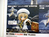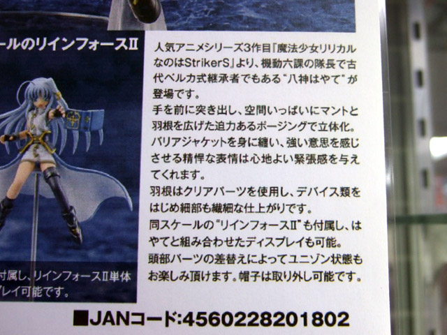 これは、以前WF2008冬での無彩色サンプルをお伝えした「魔法少女リリカルなのはStrikerS」の「八神はやて」を立体化したもので、POPの商品説明によると『人気アニメシリーズ3作目『魔法少女リリカルなのはStrikerS』より、機動六課の隊長で古代ベルカ式継承者でもある”八神はやて”が登場です。手を前に突き出し、空間いっぱいにマントと羽を広げた迫力あるポージングで立体化。バリアジャケットを身に纏い、強い意志を感じさせる精悍な表情は心地よい緊張感を与えてくれます。羽はクリアパーツを使用し、デバイス類をはじめ細部も繊細な仕上がりです。同スケールの”リインフォースII”も付属し、はやてと組み合わせたディスプレイも可能。頭部パーツの差替えによってユニゾン状態もお楽しみ頂けます。帽子は取り外し可能です。』と紹介されています。