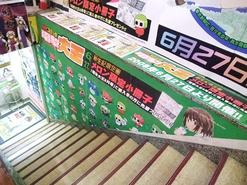 6月20日、以前、シャナの抱き枕を赤ちゃんが抱いたPOPもお伝えした、新生(ブランニュー)される雑誌「電撃大王 2008年 08月号」(AA)の巨大なポスター等の告知展開が、メロンブックス入り口階段にて掲示されています。