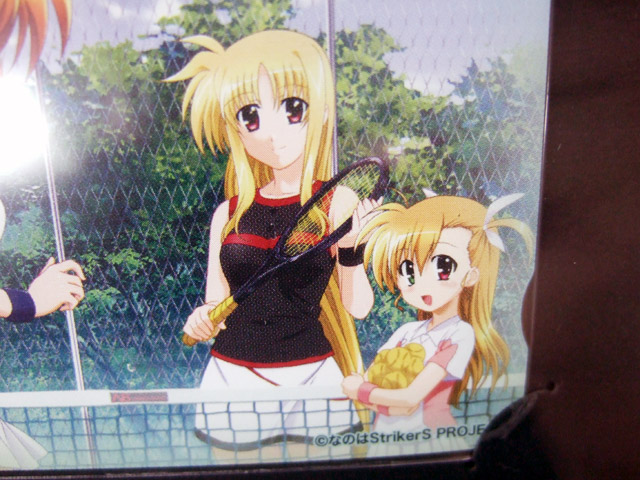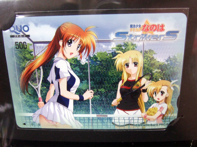 6月21日、ムービック「魔法少女リリカルなのはStrikerS チェーン付きウォレット」がキャラシティに入荷していました。これは、商品説明によると「時空管理局のロゴ入り本革製財布と、QUOカードのセット」というもの。そのQUOカードは、なのは、フェイト、ヴィヴィオのテニスルックのイラストで、なのはは、結構食い込んでいるピンクのアンスコが見えちゃってましたw