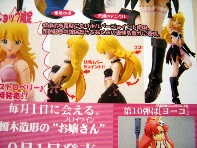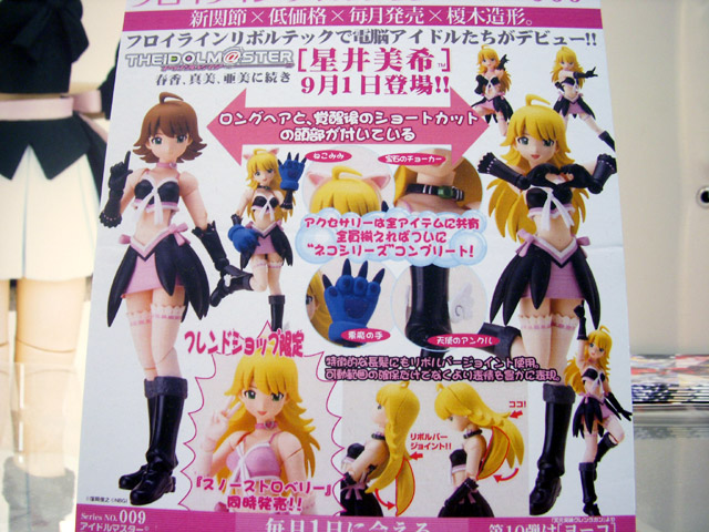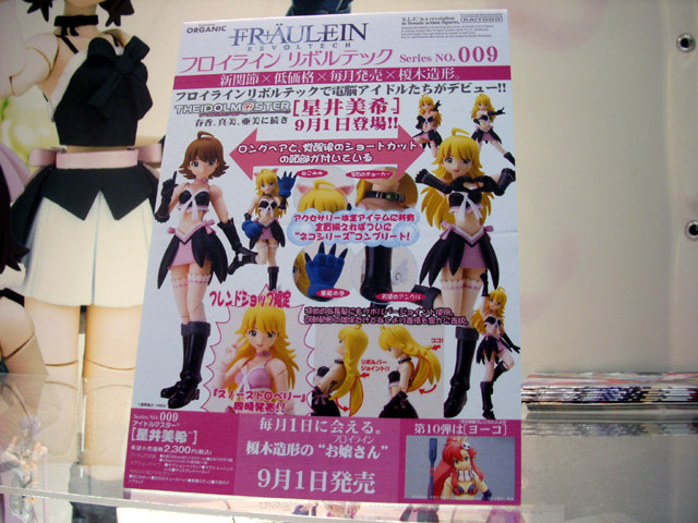 2008年6月19~22日の間開催された、東京おもちゃショー2008のオーガニックブースでは、海洋堂「フロイライン リボルテック 009 星井美希」のサンプルが展示されてたみたいです。覚醒型のヘッドパーツも付属みたい。「フロイライン リボルテック010 ヨーコ」のバストアップ画像等も掲示があったみたいです。他「よつばと 綾瀬風香 水着Ver.」の展示の様子等をまとめて。