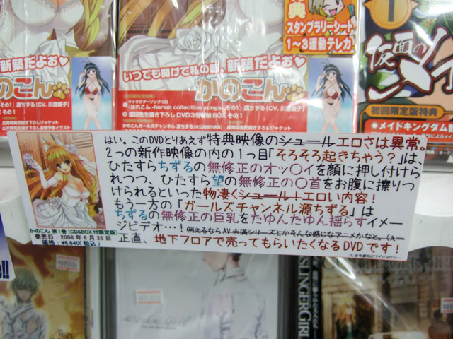 とらのあな本店のPOPで『はい。このDVDとりあえず特典映像のシュールエロさは異常。2つの新作映像の内の1つ目「そろそろ起きちゃう?」は、ひたすらちずるの無修正のオッ○イを顔に押し付けられつつ、ひたすら望の無修正の○首をお腹に擦りつけられるといった物凄くシュール!エロい内容!もう一方の「ガールズチャンネル源ちずる」はちずるの無修正の巨乳をたゆんたゆん揺らすイメージビデオ・・・!例えるならAV未満シリーズとかそんな感じなアニメかなと。(ぇー正直、地下フロアで売ってもらいたくなるDVDです!コレ全年齢向けでダイジョウブナノ・・・』とかかれ、その「無修正の巨乳をたゆんたゆん揺らすイメージビデオ」等を詳しく紹介されている、今日もやられやくさんのかのこんDVD1巻 修正点他・・・エロすぎですでは「全然隠れてないかくし芸ワロタw」「ただエロがあるのみです!」「どう見てもアウトですね本当にエロくてありがとうございました」「だめだこのDVD・・・早く18禁コーナに移さないと」等とコメントされている特典映像。
