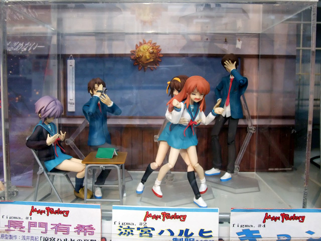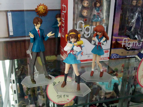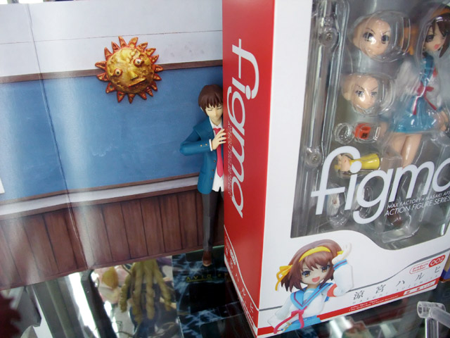 6月26日、アキバの店舗にて、マックスファクトリー figma 涼宮ハルヒの憂鬱「朝比奈みくる 制服Ver.」(AA)と「古泉一樹 制服ver.」(AA)2種のサンプル展示が開始しました。とらのあな本店では、劇中にあったハルヒがみくるの乳を揉むシーンを再現w 他、みくるフェイスを使ったやけに弱気なハルヒ等も展示。キャラシティでは不機嫌ハルヒをなだめる二人といった展示でした。