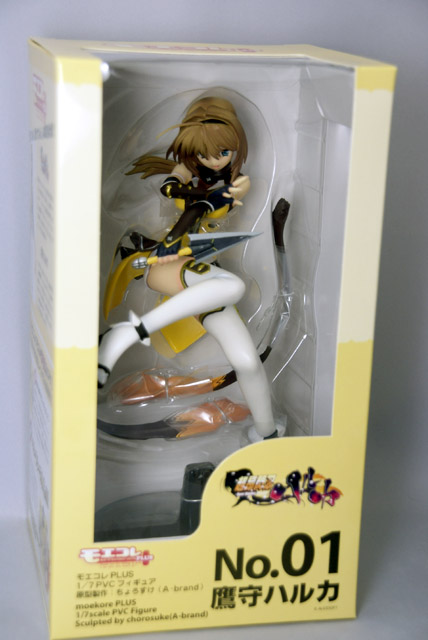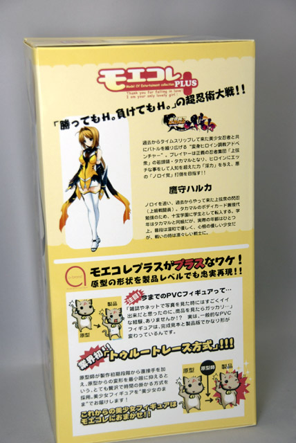 これは、ボークスのPVCフィギュアシリーズ「モエコレPLUS」の第1弾として「超昂閃忍ハルカ」のキャラ「ハルカ」を立体化したもので、ボークスの商品説明によると『くノ一装束に身を包み、戦う変身ヒロイン 記念すべき第1号アイテムは『超昴閃忍ハルカ』のメインヒロイン!戦闘シーンの一場面を切り取ったかのような構図は見所が満載(フトモモの隙間とか・・・)。可愛くも凛々しいハルカを完成品で手に入れるチャンス!初回生産分受注特典!スペシャルクリアトレカ付属!!』と紹介されています。