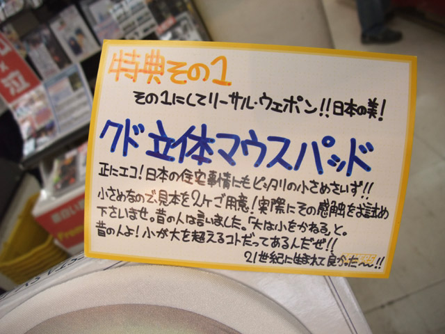 ゲーマーズ本店では、POPに『特典その1 その1にしてリーサル・ウェポン!!日本の美!「クド立体マウスパッド」正にエコ!日本の住宅事情にもピッタリの小さめさいず!!小さめなので、見本を2ヶご用意!実際にその感触をお確かめ下さいませ。昔の人は言いました。「大は小をかねる」と。昔の人よ!小が大を超えるコトだってあるんだぜ!!21世紀に生まれて良かった~~!!』として『クド 立体マウスパッド』のサンプルを生展示していました。