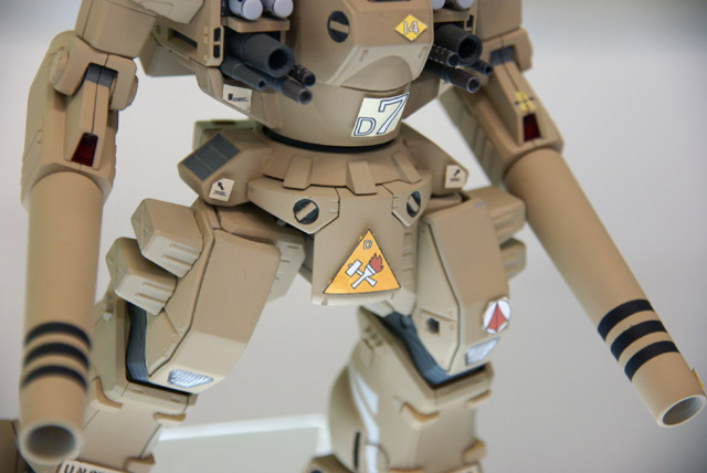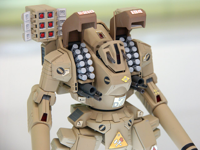デストロイト トマホークは、デストロイト トマホーク – Wikipediaによると『デストロイド(DESTROID)は、SFアニメ『超時空要塞マクロス』および関連作品に登場する架空の兵器。DESTROY(破壊)とANDROID(人型ロボット)の造語で総称される、陸戦用二足歩行ロボットの兵器体系。~重装砲撃型デストロイド。型式名MBR(Main Battle Robot)は現用の主力戦車、MBT(Main Battle Tank)に由来する。機体前面に各種武装を配し、集中的火力により中~近距離域の敵陸上兵力を殲滅する。Mk.IVは初めて制式採用されたデストロイドシリーズの主力機であり、MK.Iの両腕を荷電粒子ビーム砲に置き換え、更なる火力向上を図っている。格闘能力の低下は、胸部ガンクラスターの機関銃やグレネードランチャー、火炎放射器などの近接兵器で補っている。肩腕部はウェポンベイとして随時換装可能で、04系の特徴である上半身の独立した燃料発電機により稼動する。主力戦車的な機体であり、6連対空ミサイルを持つとはいえ04系の中ではマクロス艦上ではもっとも防空任務に不向きであったが、ダイダロスアタック時には最前列に陣取り、水平方向への強力な攻撃力を見せつけた。』という機体。