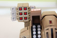 やまとのデストロイド特集ページによると『この「デストロイド」というメカは真正面から取り組むと膨大なアンダーカット(金型から抜けないため成型不可能な角度の面やディテール)に悩まされるのですが、「造形の追及」という当初の課題を念頭に、まずは手書き図面と参考原型からギミックや分割を仕込まない外観形状を追いかけることに専念しました。』というディティール面は、まだ仮付けのシールなどもありますが、かなり細かい部分までしっかりと作りこまれていますね!