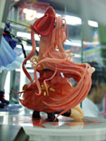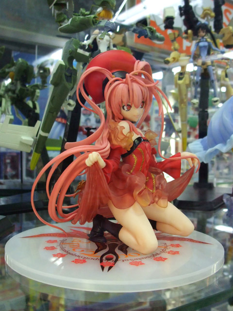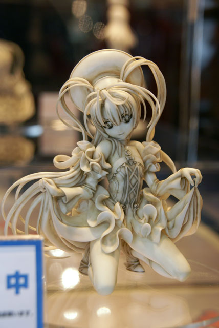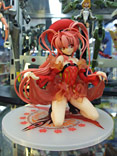 これは、以前ホビコン 02東京での無彩色サンプル等をお伝えした「機神飛翔デモンベイン」のキャラ「アナザーブラッド」を立体化したもの。スカートを自らたくし上げたポーズで、マックスの商品説明によると『2006年5月にニトロプラスより発売した3Dアクションゲーム『機神飛翔デモンベイン』より、紅いドレスの謎の少女 「アナザーブラッド」が登場です。「血」をイメージさせる印象的な紅いコスチュームを鮮やかに表現。挑発的なポーズや表情、クリアパーツのスカートから覗く太股が何とも魅惑的。文字通りの「紅の少女」を見事に再現したファン必須のアイテムです』と紹介されています。