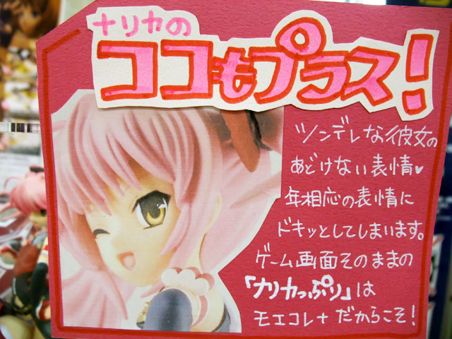 サンプルの周りに掲示されていたPOPのうちのひとつによると「ツンデレな彼女のあどけない表情♥年相応の表情にドキッとしてしまいます。ゲーム画面そのままの「ナリカっぷり」はモエコレ+だからこそ!」という、ナリカの顔や乳具合など。